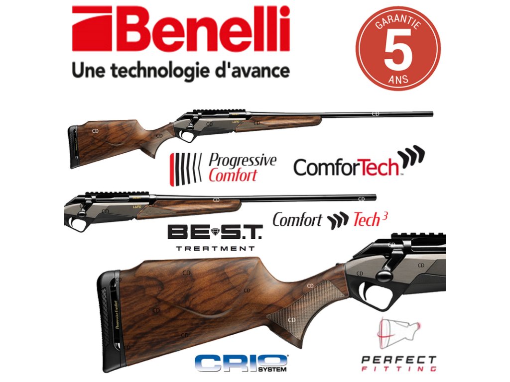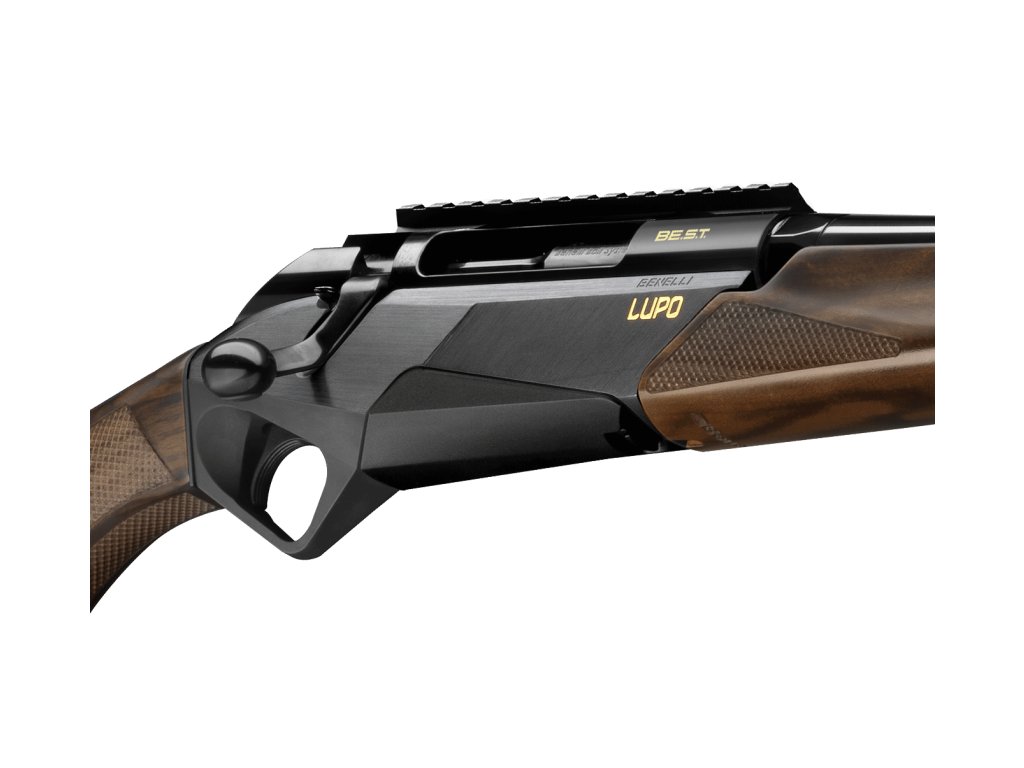 Model opakovací kulovnice Benelli Lupo s dřevěnou pažbou, ergonomicky tvarovanou pažbou s řadou inovativních prvků. Byla navržena pro maximální přesnost střelby a díky použité technologii criogenické úpravě hlavně je přesnost pod 1 MOA. Samotná hlaveň je volně plovoucí s odolnou povrchovou úpravou Benelli BE.S.T. Spoušť je jemná s jasným bodovým chodem a stavitelným odporem 1-2kg. Hřbetní pojistka je lehce ovladatelná a snadno dostupná.Unikátní funkcí kulovnice Benelli Lupo je nastavení sklonu pažby a pozice spouště. Podložky pro úpravu sklonu či vybočení pažby umožňují nastavení až ve 36 různých polohách. Optimální polohy tak lze dosáhnout pomocí 2 podložek v krčku pažby a 1 podložkou v pažbě. Zbraň tak lze přizpůsobit indidividuálním potřebám daného střelce. Odnímatelný dvouřadý zásobník pojme 5 nábojů a díky svému tvaru zcela splývá s tělem kulovnice. Hlaveň je na konci vybavena závitem M14x1