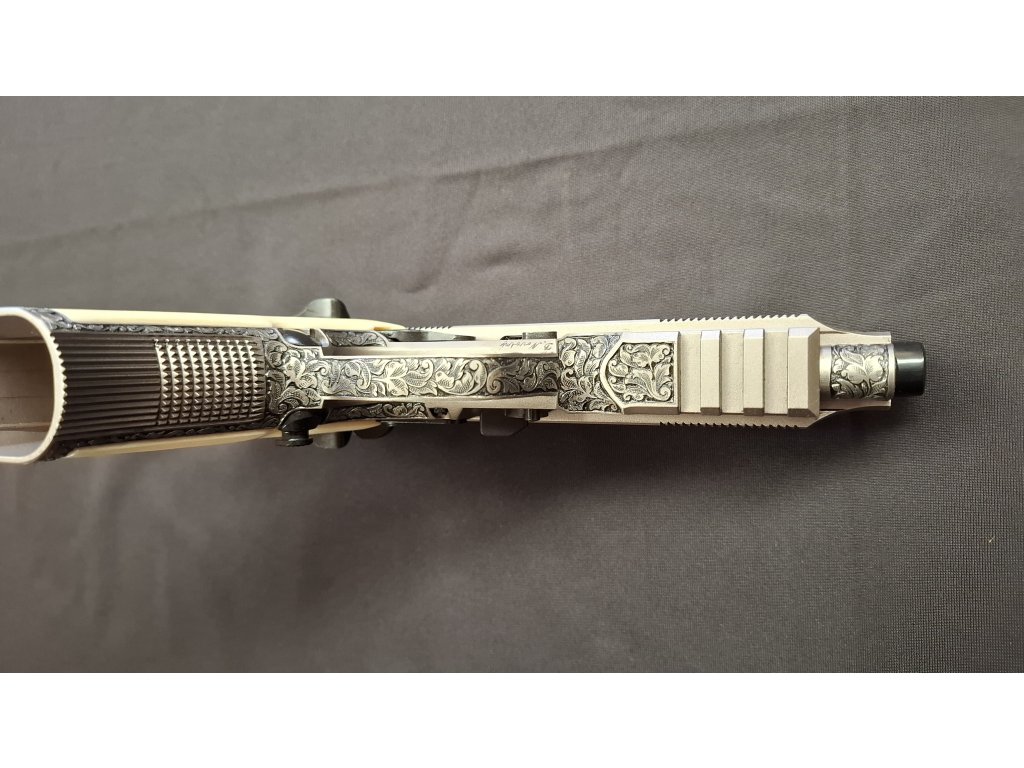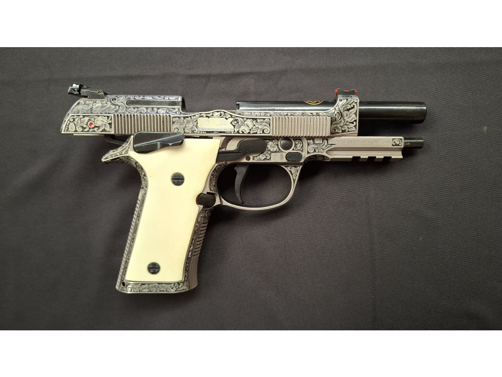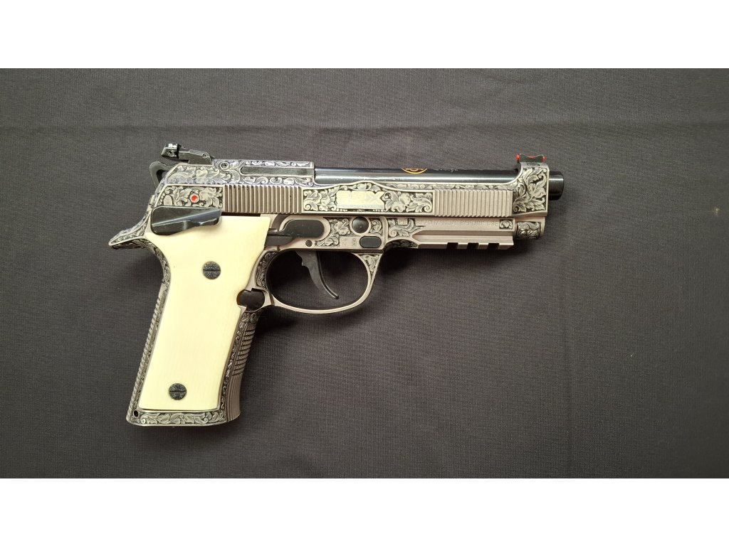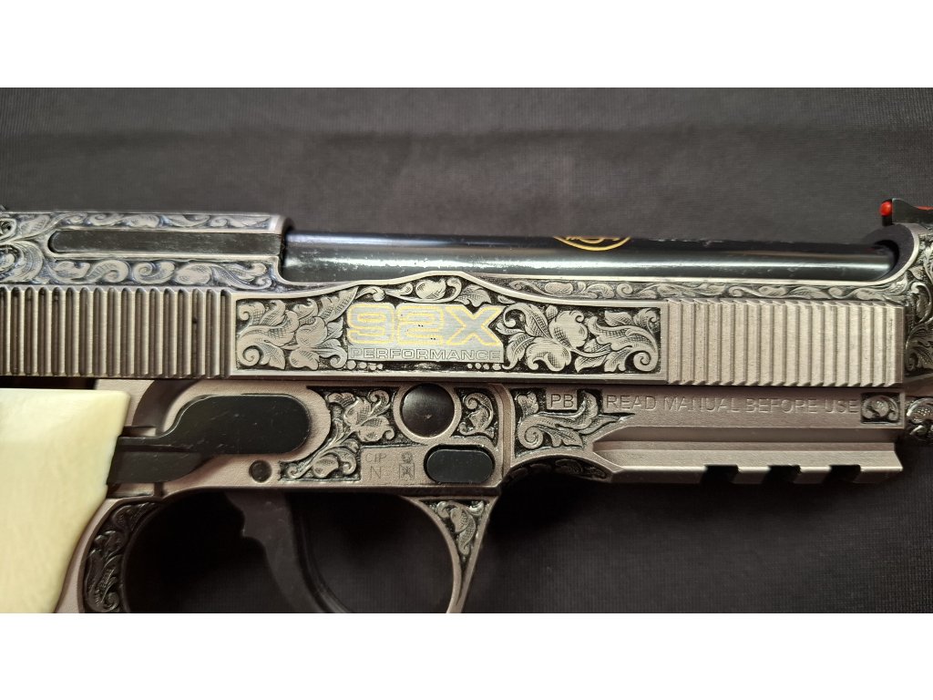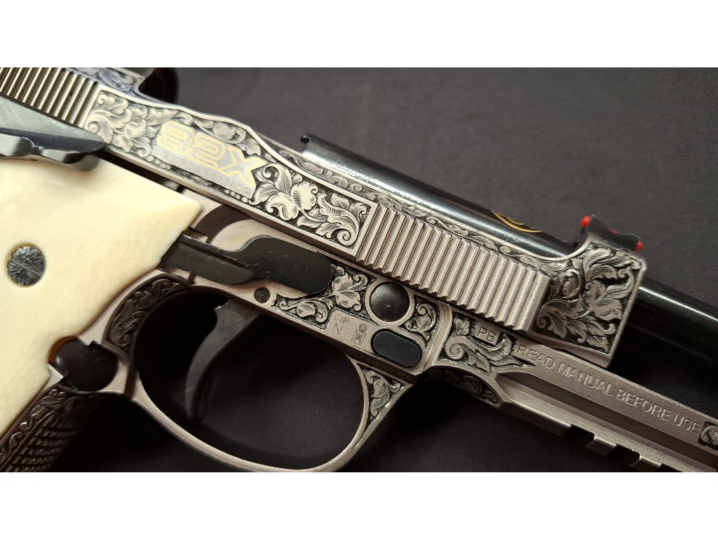 Luxusně rytá Beretta 92FS X Performance . Zbraň je nová jednína svého druhu, logo Beretta a znak 92x jsou vykládané zlatem střenky jsou z mamutoviny.
