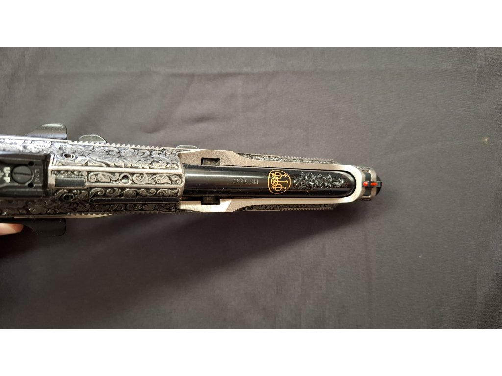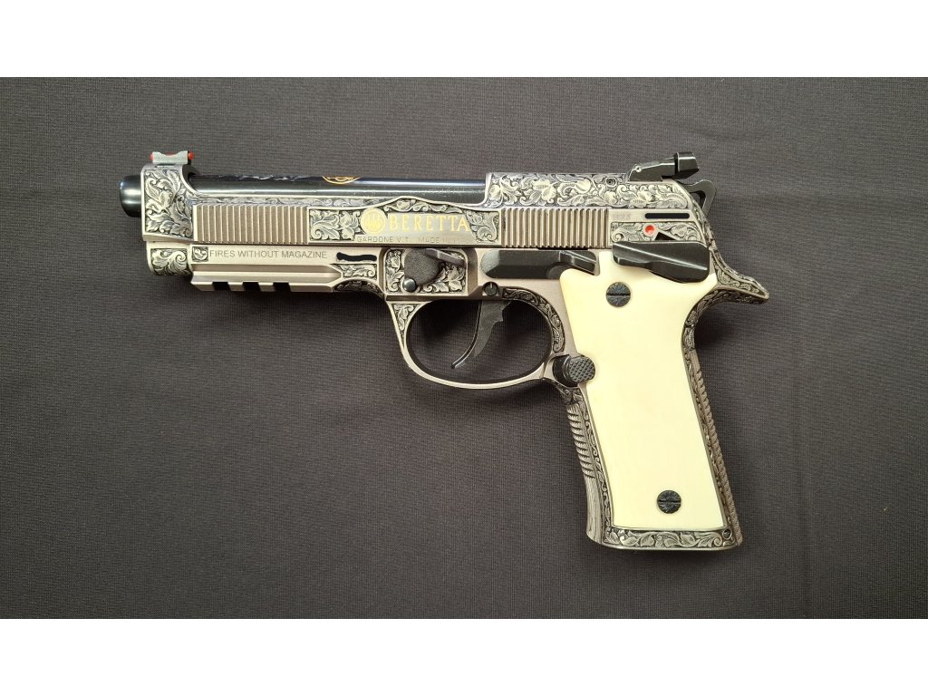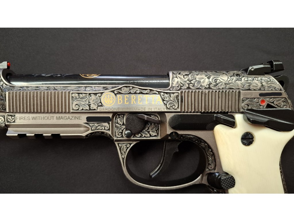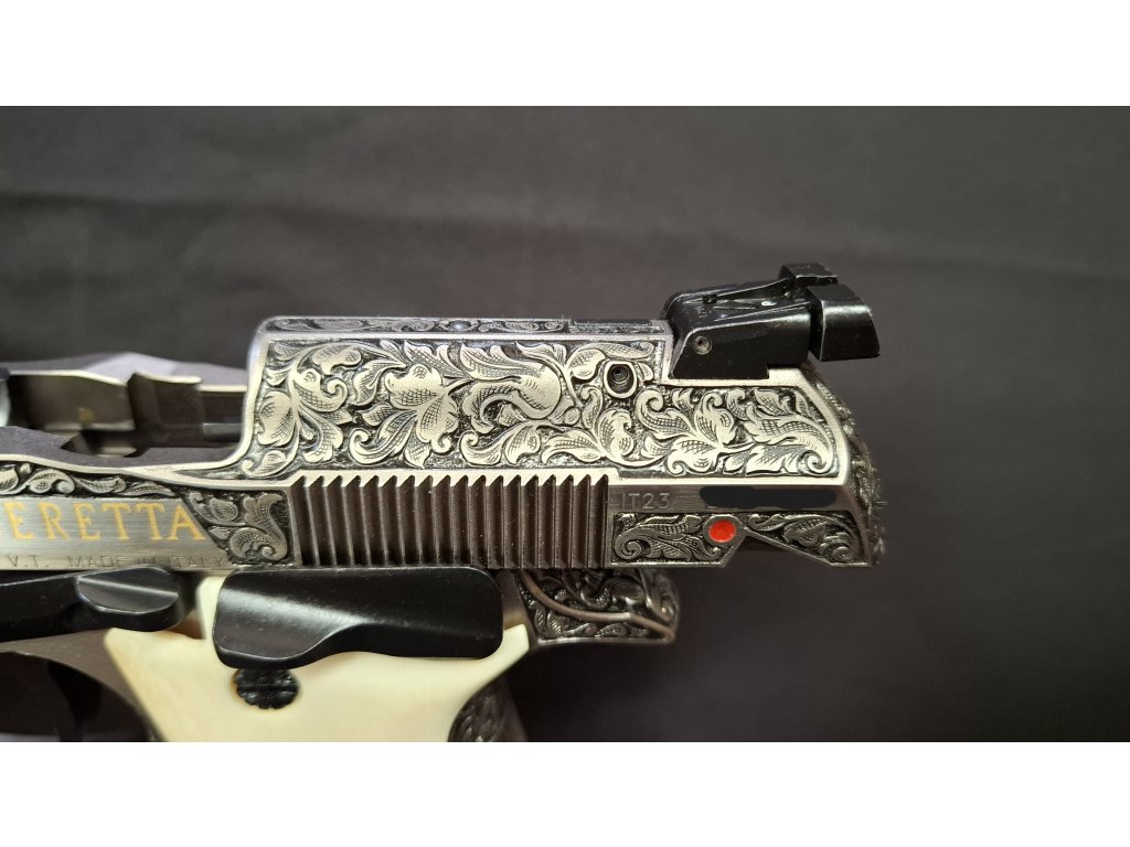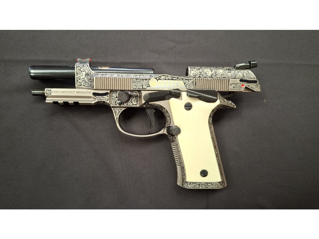 Luxusně rytá Beretta 92FS X Performance . Zbraň je nová jednína svého druhu, logo Beretta a znak 92x jsou vykládané zlatem střenky jsou z mamutoviny.