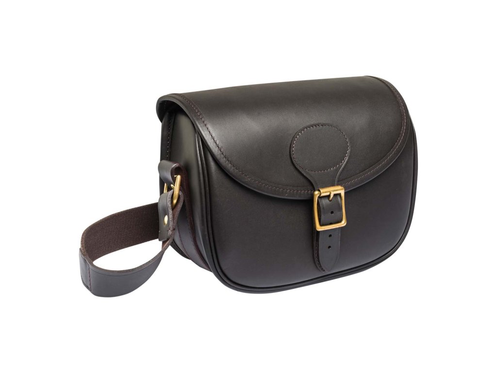 Brašna na náboje s vložkami z pravé kůže s klopovým uzávěrem.