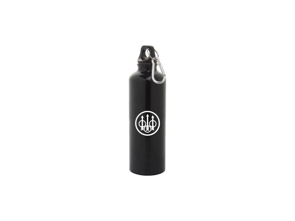 Lesklá černá kovová láhev s bílým potiskem loga Beretta. Uzávěr s karabinkou pro praktické přenášení připevněný například k batohu.