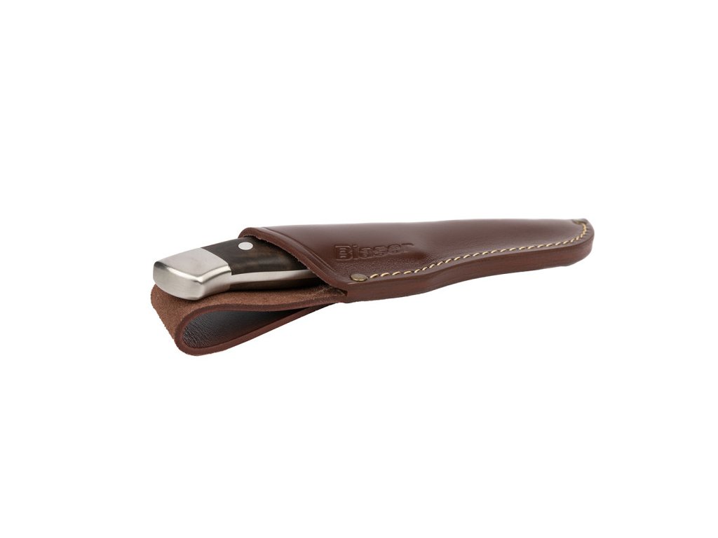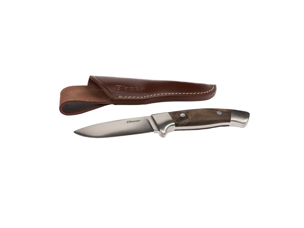 Lovecký nůž Blaser vyrobený z pevné nožířské oceli 440C je velmi pevný a ostrý. Rukojeť je vyrobena z elegantního ořechového dřeva a ta mu dodává zvláštní vzhled.Široká čepel typu drop-point. Konstrukce full-tang s čepelí a rukojetí z jednoho kusu oceli zajišťuje mimořádně dobrou stabilitu. Ergonomický tvar umožňuje pohodlné držení. Snadno se brousí. Součástí je kožené pouzdro z kvalitní hovězí kůže s kontrastním prošíváním a poutkem na opasek. Celková délka: 21 cmDélka čepele: 9 cmDélka rukojeti: 12 cm