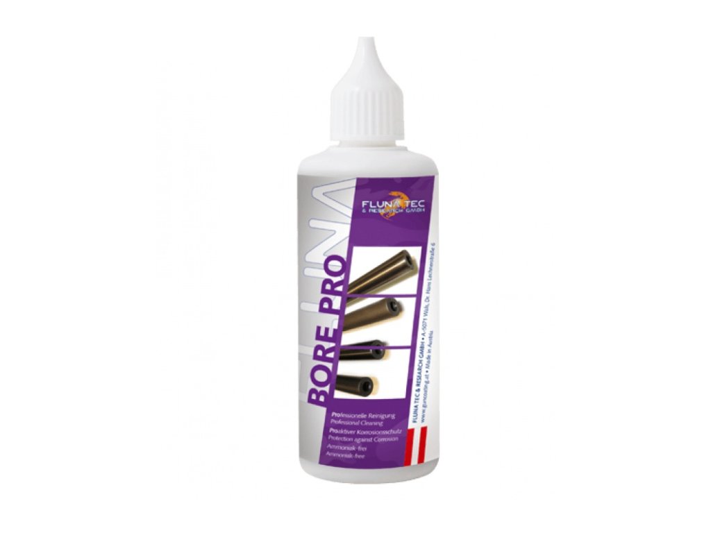 BORE PRO od rakouského výrobce FLUNA TEC dokáže vyčistit veškeré zbytky zanechané střelným prachem, ale především dokáže odstranit měděné a tombakové usazeniny. Lze jej použít ve všech typech hlavní. Zároveň hlaveň převádí a účinně ji chrání proti korozi.