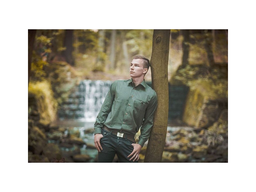 ze 100% bavlny drobné šedozelené káro s úpravou easy-care pro snadnou údržbu a se sníženou mačkavostí. Celou košili doplňují jedinečné ručně vyrobené knoflíky z imitace paroží.