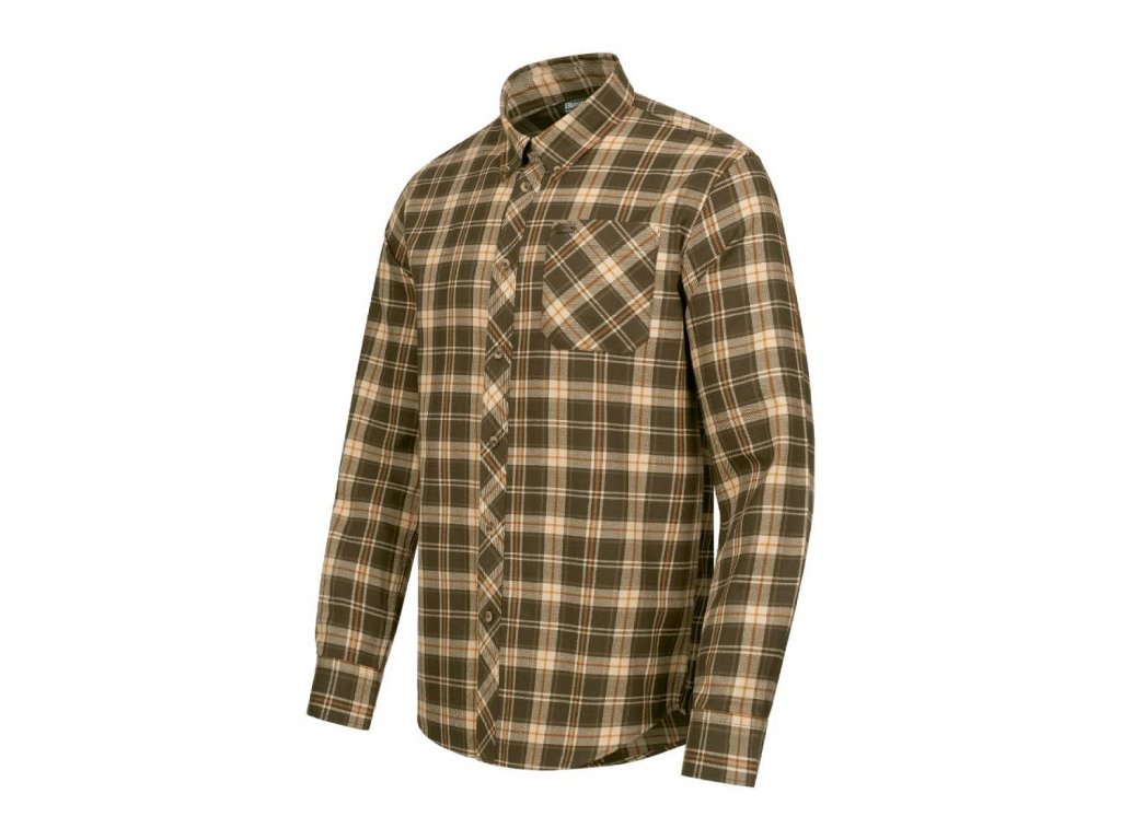 Příjemná flanelová košile, nepatrně projmutá, s dlouhým rukávem, ze směsi bavlny a polyesteru. Límeček zdobí dva knoflíčky, na náprsní kapse vlevo je na koženkovém štítku logo Argali. Toto logo nechybí ani v dolním okraji knoflíkové légy.
