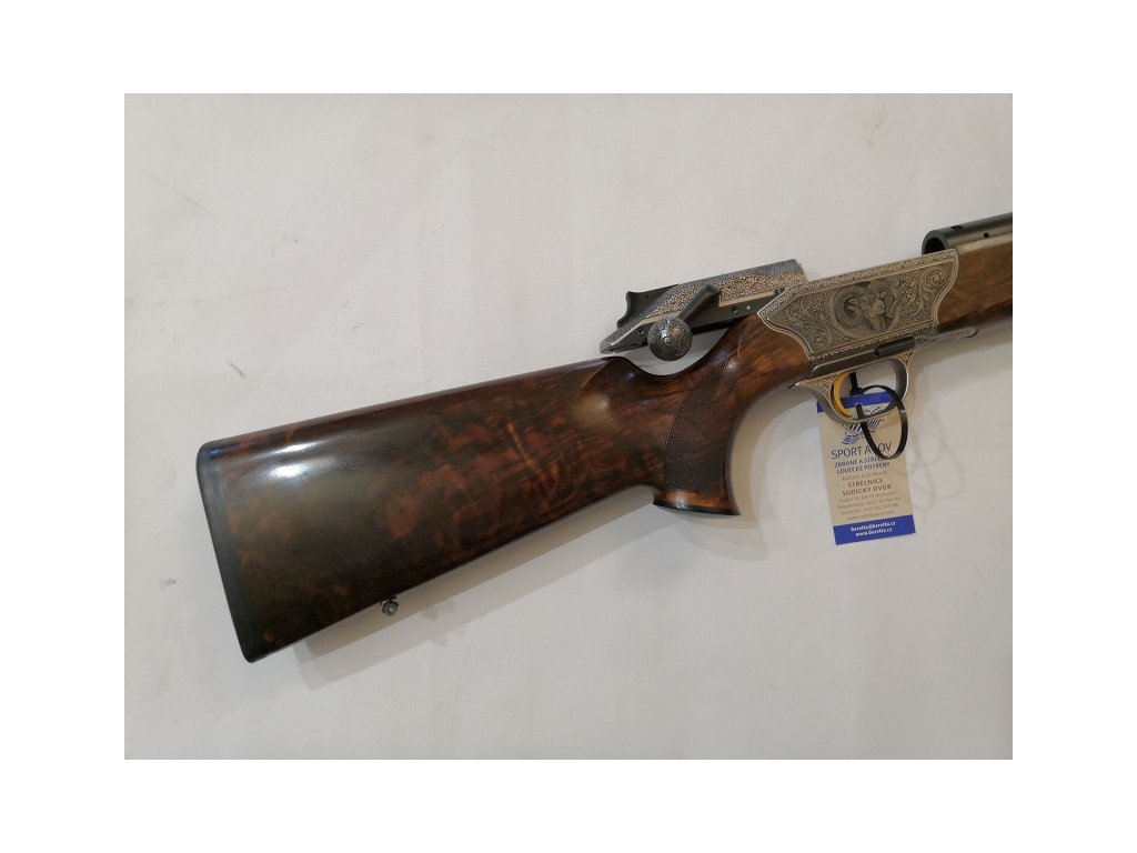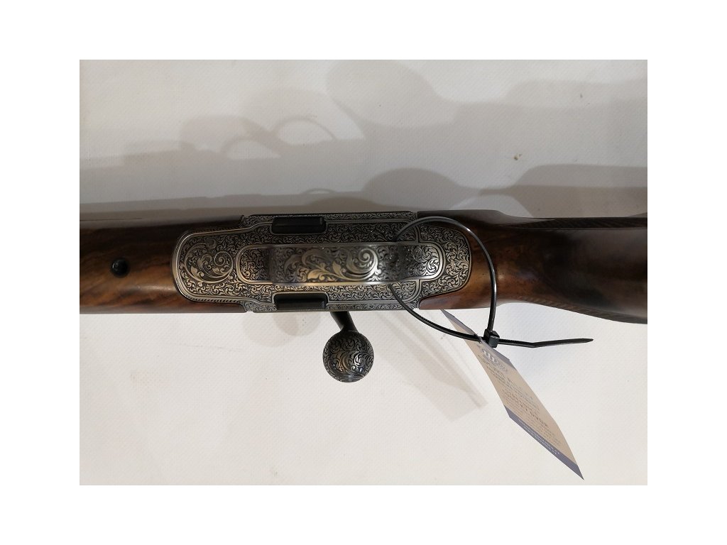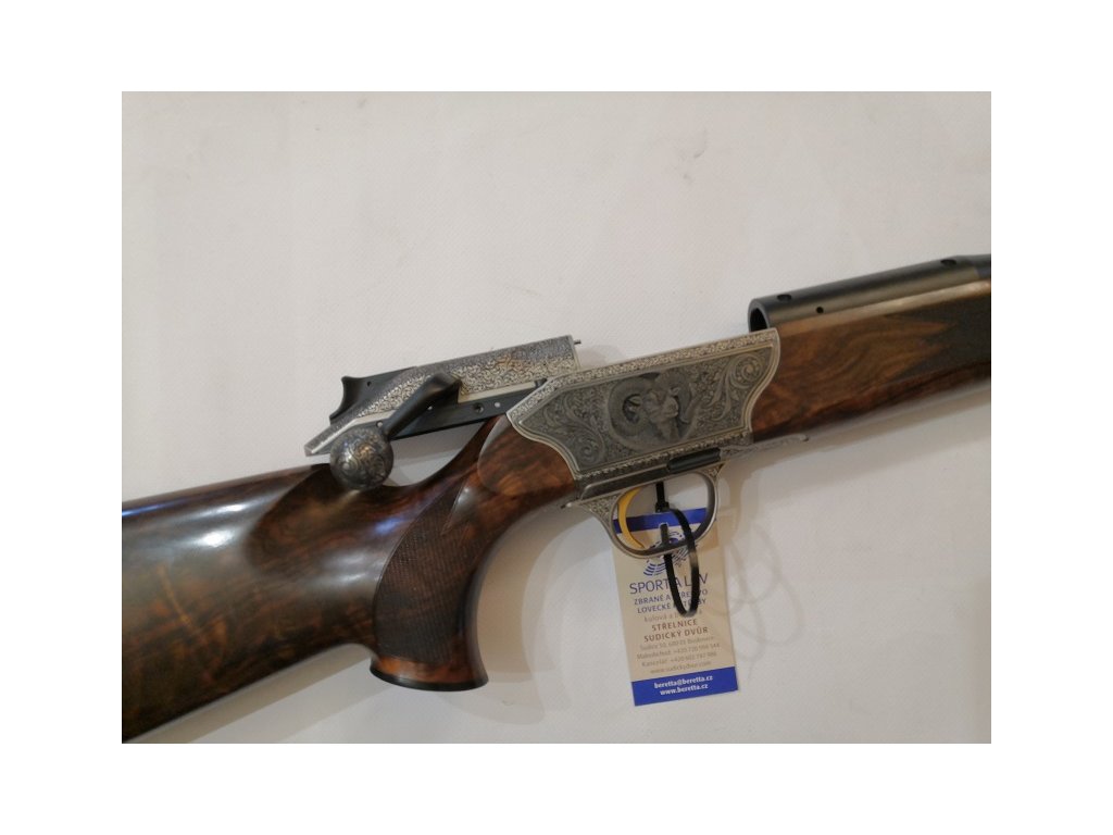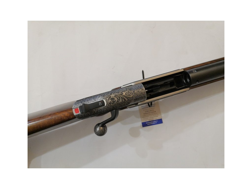 Blaser R8 zdobená luxusní rytinou zobrazující jelena na druhé straně muflon.