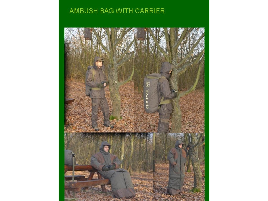 Vodotěsný teplý posedový vak, podšitý bavlnou a polstrováním, s hnědým koženým lemováním. Uzavírá se na zip a přezky. S velkou kapucí, kterou lze nastavit.