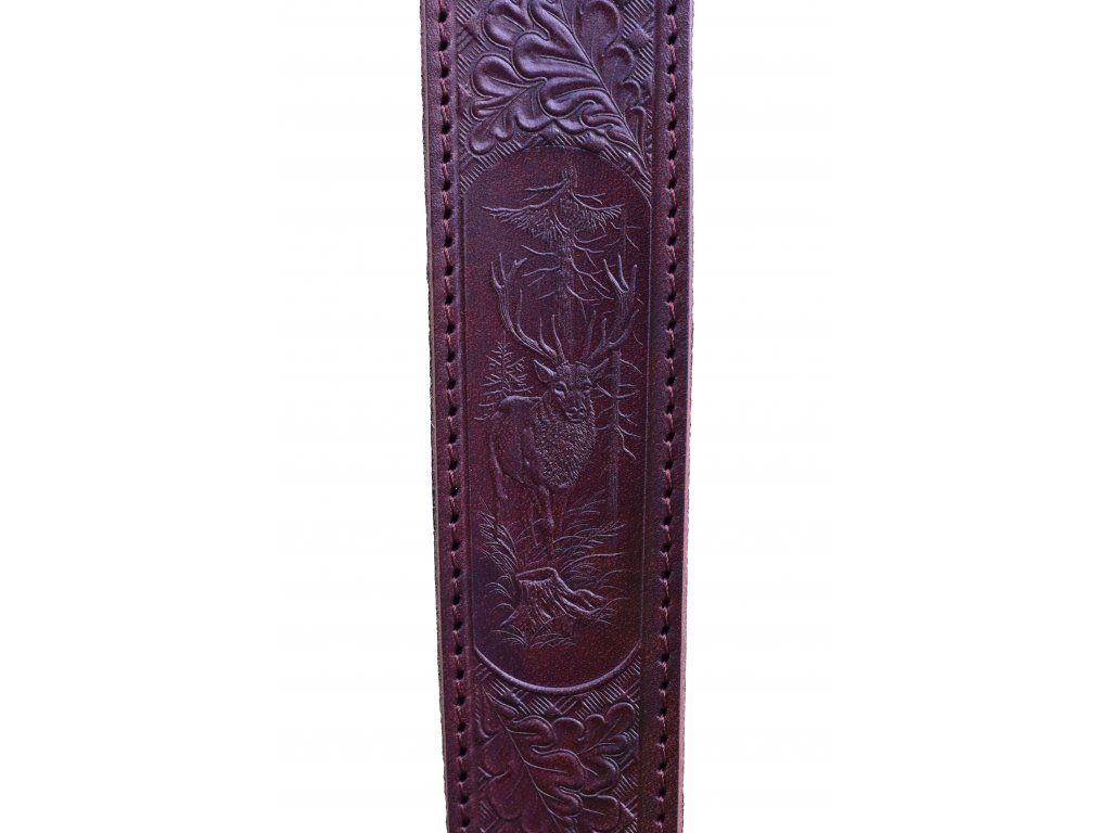 materiál: hovězinová kůžeřemen je podšitý protiskluzovou gumoušíře: 5 cmhluboká ražba motivů zvěře do kůže